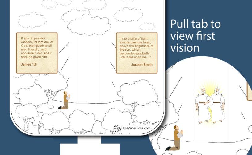 For my very first LDS Paper Toy, I have chosen the first vision. Your children can watch Joseph as he prays and then Heavenly Father and Jesus Christ descend in a pillar of light. They simply pull on the tab in the back to make the movement. So fun!