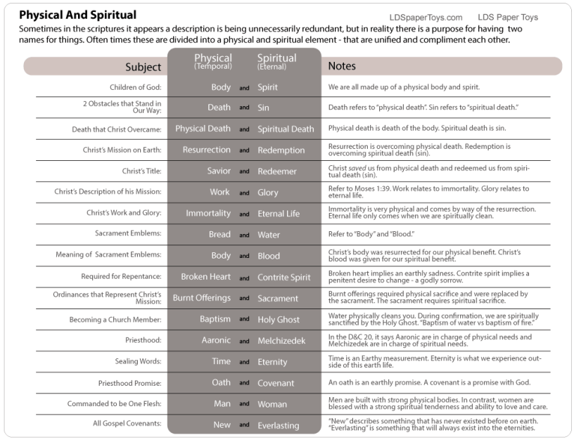 This chart was simply created to remind the reader to be mindful when reading the scriptures. Sometimes words in the scriptures can seem unnecessarily redundant, but are actually intentionally placed. In the examples you will see how these words are two parts of a whole, separated physically and spiritually (or temporally and eternally.)