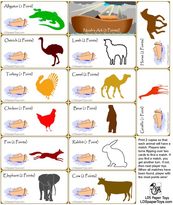 Looking for a Sunday game for smaller children? Or trying to teach a lesson on Noah? I tried this one out with my six-year-old yesterday. Worked great. It plays like the classic memory card game, but has a “Noah and the Ark” theme. Another difference is that your score is based on points shown on the card not number of matches. (The Ark card is worth 3 points)
