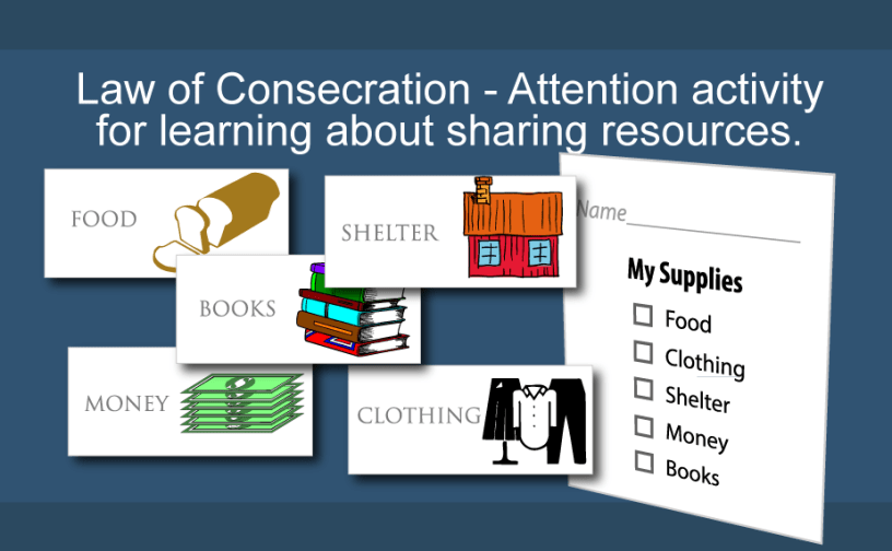 This is an Attention Activity that teaches children that righteously sharing resources helps everyone. This works well for a primary class, home teaching visit or FHE lesson dealing with the Law of Consecration or sharing.