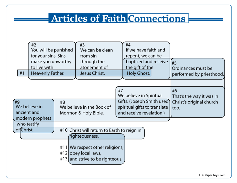 There really is no stand-alone gospel topic. It’s impossible to take a gospel topic and not have others interwoven. That stays true for the Articles of Faith. They are placed in a logical order and are easily overlapped by each other. Here is one example of how they could be connected.