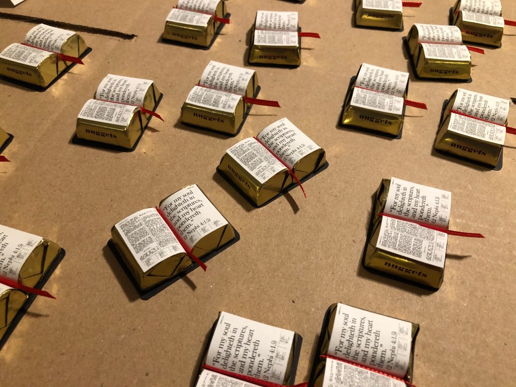 These are so cool! They are tiny scriptures made from chocolate. I’ve seen variations all over the internet, but none quite like this. If you are looking for the most awesome version, you found it. (And don’t let the images fool you, it looks way better in real life.)